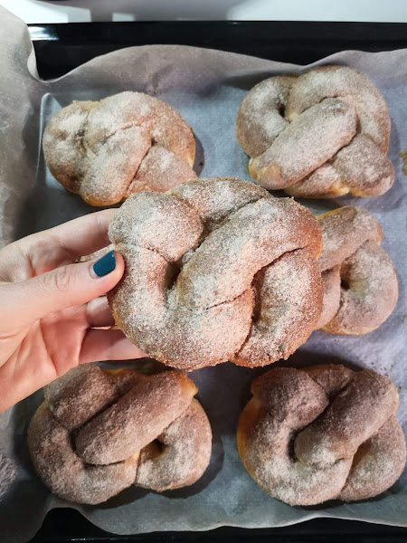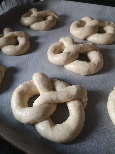 Repetimos esto con los 8 pretzels y los colocamos en una bandeja con papel antiadherente. Dejamos destapados durante 20 minutos para que suban y luego los pasamos al frigorífico durante 15 minutos.