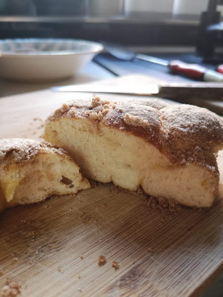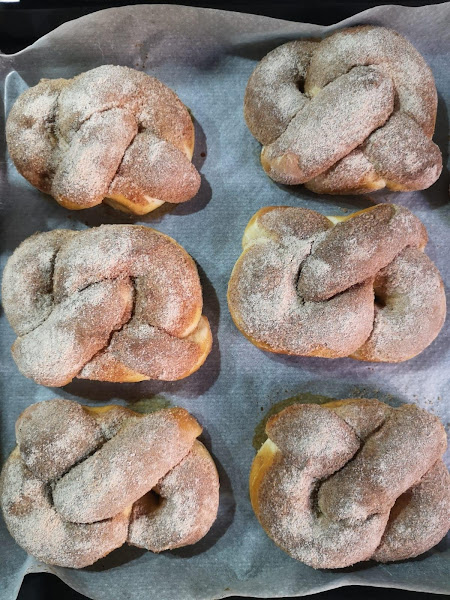 Mientras están aún templados, pintamos con la mantequilla derretida y sumergimos en la mezcla de azúcar y canela.