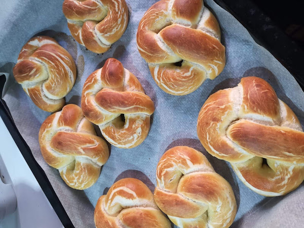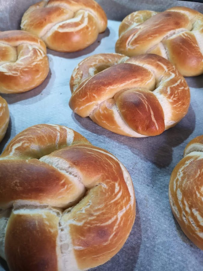 Mientras, encendemos el horno a 200º con ventilador. Preparamos el agua. Llevamos a ebullición y añadimos el bicarbonato. Dejamos hervir cada pretzel durante 10 segundos, los sacamos con ayuda de una espátula cuidando de escurrirlos al máximo. Los ponemos en una bandeja de horno con papel antiadherente y horneamos de 8 a 10 minutos hasta que estén dorados.