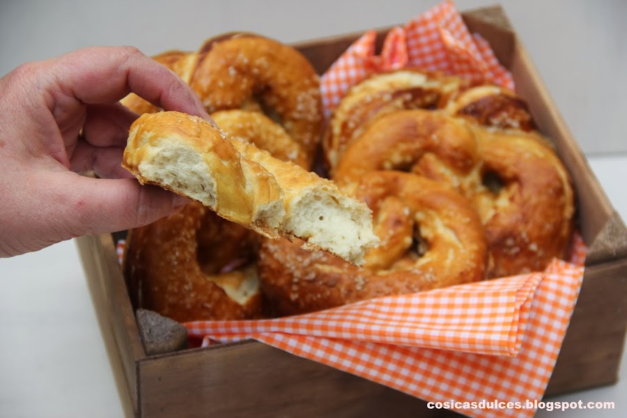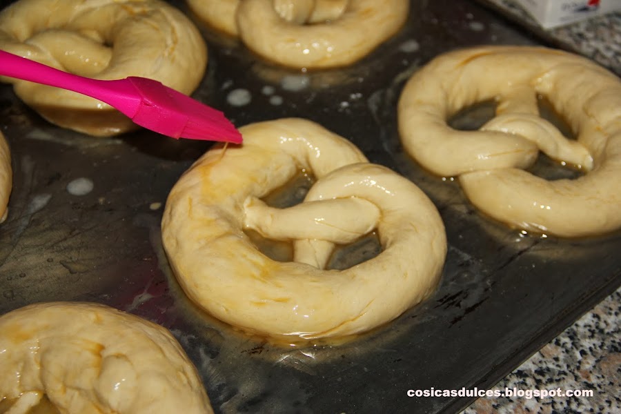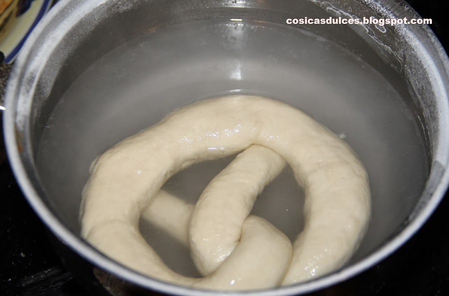 Después del levado dividimos la masa en bolitas del mismo peso y estiramos cada una de ellas hasta los 40 centímetros de largo dejando los extremos algo más finos que el centro y damos la forma de lazo característica. Mientras tanto ponemos al fuego el agua con el bicarbonato. Cuando rompa a hervir retiramos del fuego y bañamos cada uno de nuestros panecillos durante unos 60 segundos.