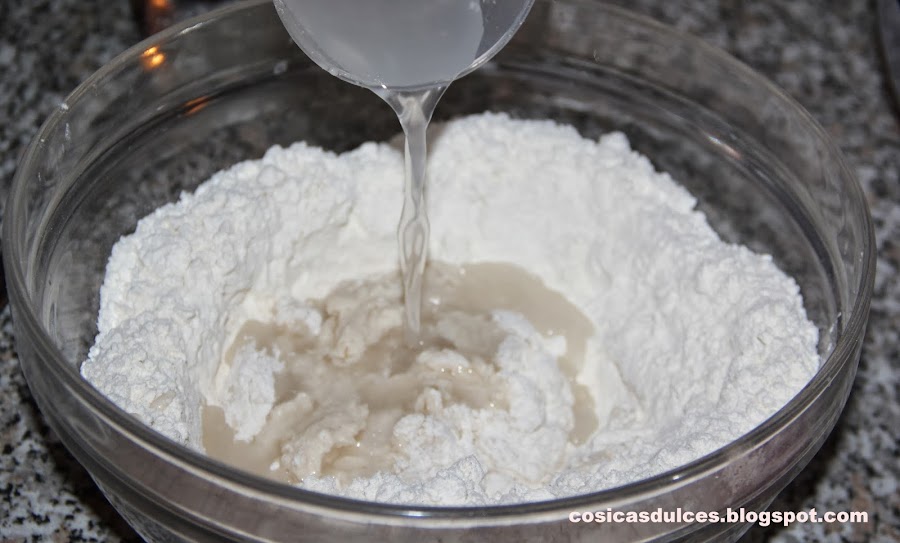 Comenzamos por disolver la levadura en la mitad del agua. Sobre la superficie de trabajo colocamos la harina mezclada con la sal. Hacemos un volcán y vertemos en el centro la manteca, la levadura que hemos disuelto en el agua, y el resto del agua.