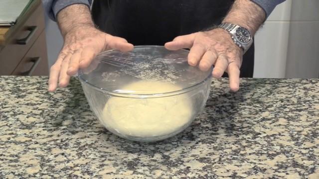 Dejaremos reposar la masa dentro de un bol con un poco de harina en el fondo, hasta que doble el volumen. Taparemos el bol con papel film. Ha reposado durante una hora.