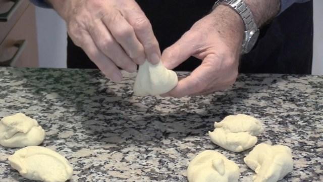 Echamos un poco de harina en la mesa de trabajo y hacemos porciones de masa de un peso de 75 gramos cada una. Hacemos una bolita cogiendo la masa y damos la vuelta empujando la masa hacia adentro y con el cuenco de la mano acabamos de hacer una bola, tal como se ve en el vídeo.