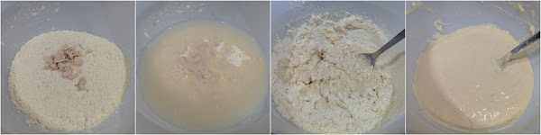 Ponemos en un bol la harina, el azúcar, la levadura desmenuzada y añadimos el agua, mezclando con una cuchara. Tiene que quedar con una consistencia cremosa. Cubrimos con bolsa de plástico y dejamos descansar en un lugar cálido y sin corrientes de aire, aproximadamente 40 minutos.