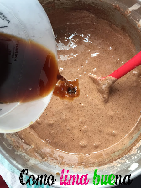 Agregamos los ingredientes secos intercalando con el café (un poco de secos, un poco de café, mezclo, un poco de secos, café, mezclo y así...).