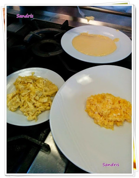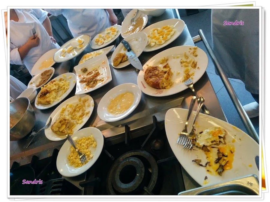 Ha sido una clase de huevos. Sí, sí, de huevos hablando literalmente!!! :-) Nos ha enseñado como cocinar el huevo de diferentes maneras y la verdad que... ole!!!! Qué cambio el comerte el huevo a como nos lo solemos comer a como lo ha cocinado él!!! Vaya tela como cambia la cosa!!! Pero por supuesto... luego los hemos cocinado nosotros mismos, no faltaría más!!! :-) Ah, y por supuesto... el rey de los huevos... la tortilla de patatas!!! Mi partida ha hecho una tortilla de 6 huevos, con patatita y cebolla. Y nos ha salido genial!!! Con un gran sabor y la patata en su punto. El profe dijo que estaba algo pasada, que le hubiera gustado algo más jugosita, pero shhhhhhhhhh, no le digáis que a mí me gusta así!!! :-)
