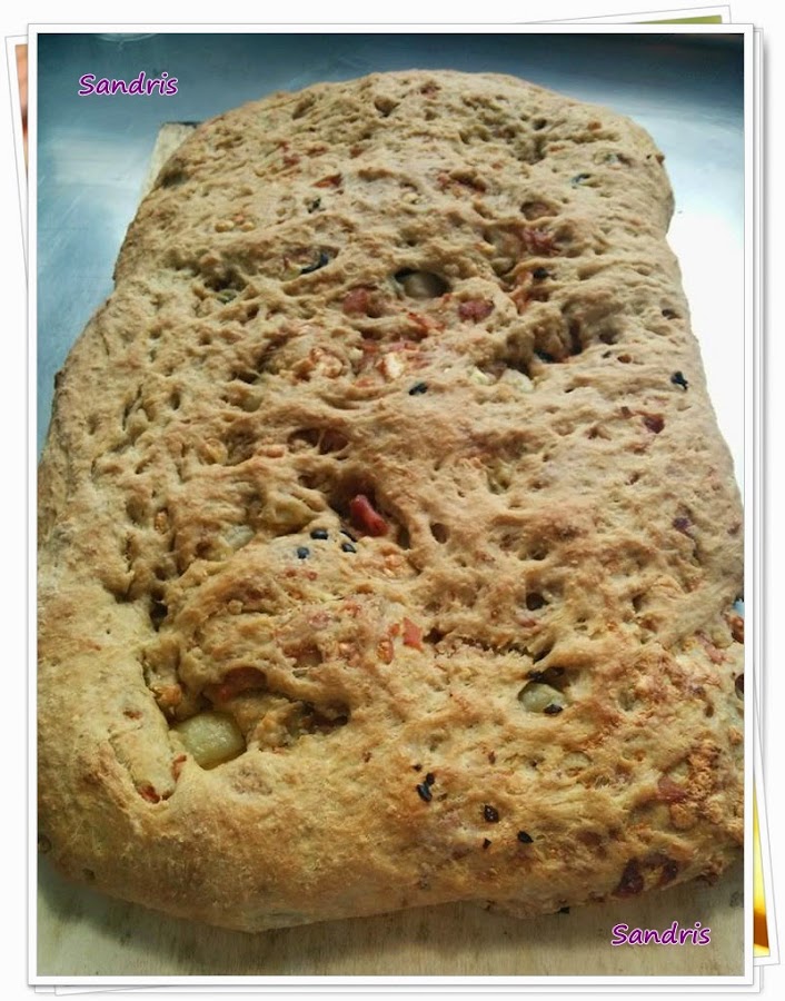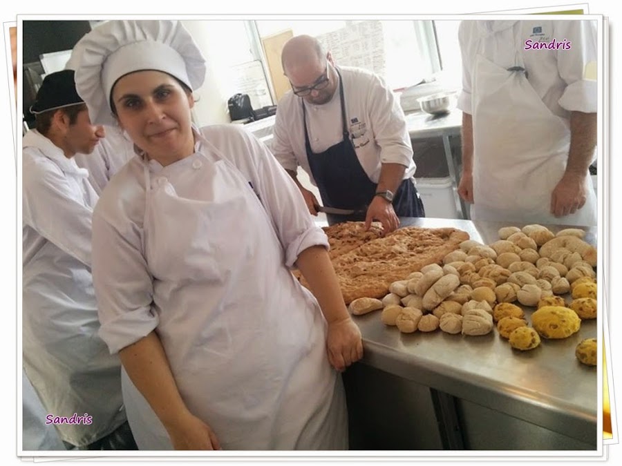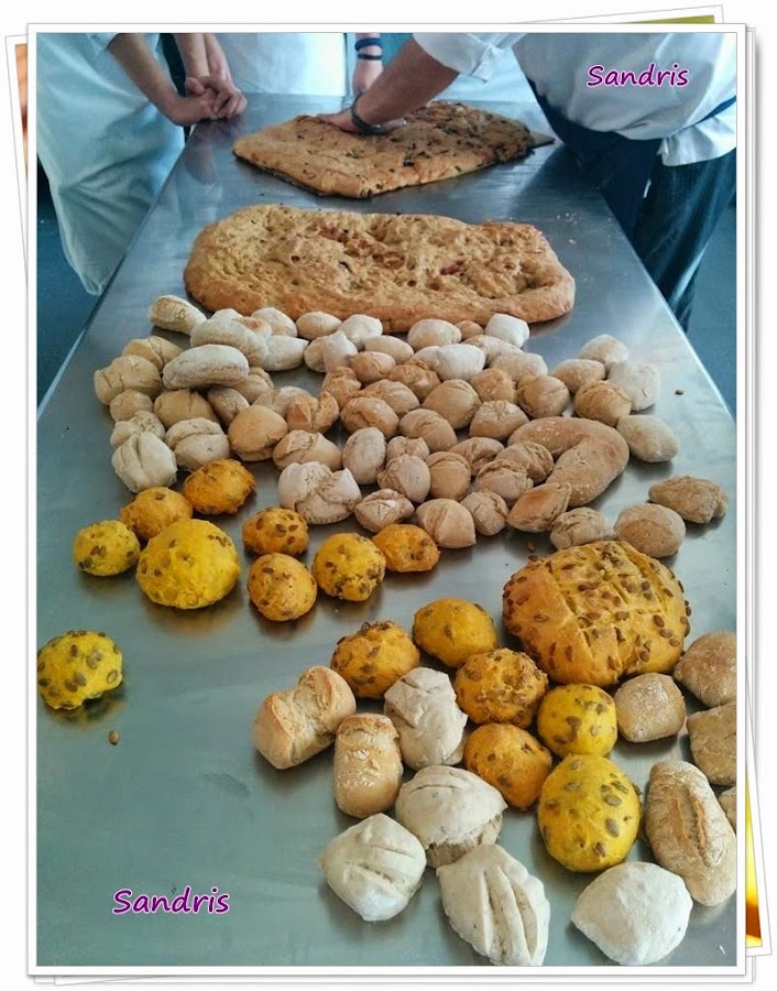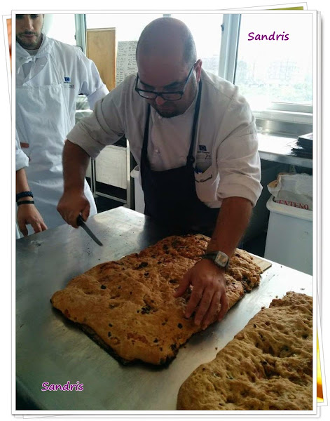 Con Joan estuvimos en la clase de panadería. Hicimos un montón de cosas muy muy ricas!!! Focaccia de bacon, jamón york, queso azul, aceitunas negras, salvia. Hicimos dos focaccias, con los mismos ingredientes pero una con pera y la otra sin pera. Hicimos pan de chapata, pan de centeno y mi preferido... pan de calabaza!!! Menos en los buñuelos de calabaza que hacemos normalmente en Fallas, no me suele gustar la calabaza, pero este pan... de los 3 que hicimos... me ha encantado!!! Qué bueno!!! Y encima con pepitas de calabaza bien crujientitas... rico rico rico!!! :-)