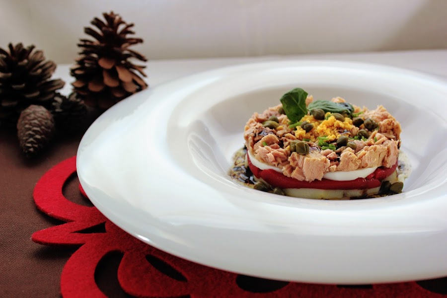 Timbal de atún, piquillos y vinagreta de aceitunas negras