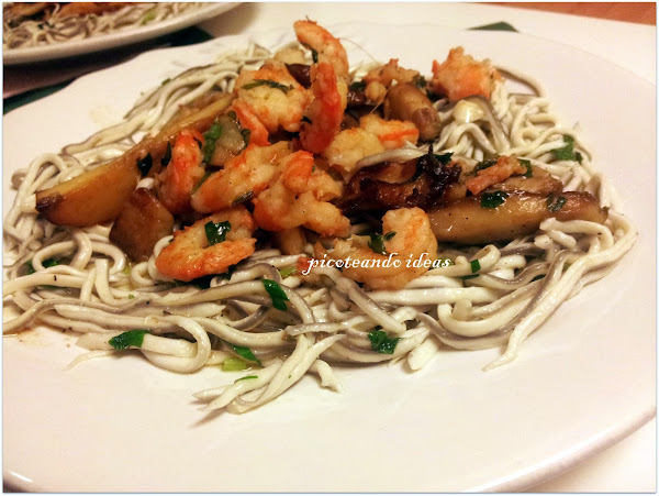 Boletus, gambas y angulas sucedáneas, la combinación no puede ser más rica. Lo puedes ver en el blog Picoteando ideas.