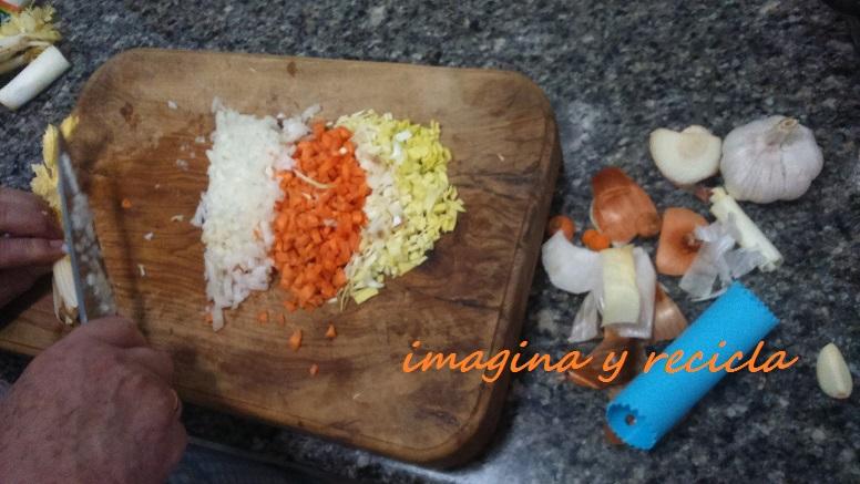 1. se trocean la cebolla, zanahoria, el ajo y el puerro en trocitos pequeños
