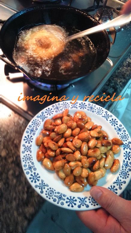 6. Se recoge con un colador lo que queda en el aceite y se sumergen las almendras crudas en el aceite ya caliente,como mucho 5 segundos para que no se quemen. Se dejan a parte.