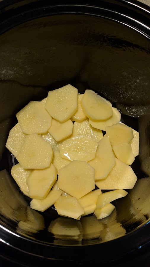 Pelar y partir las patatas en rodajas gruesas. Frotar con aceite la base de la cubeta. Colocar las rodajas