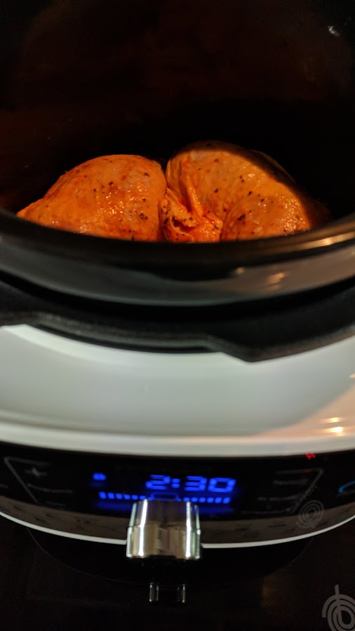 La cocina lenta de la fussioncook solo permite el modo alto equivalente a las crockpot. Para esta receta no me importaba pues quería una cocción a 110 grados.