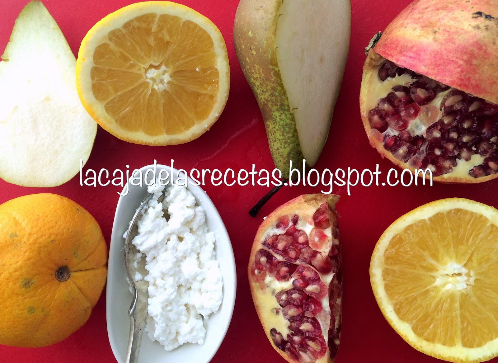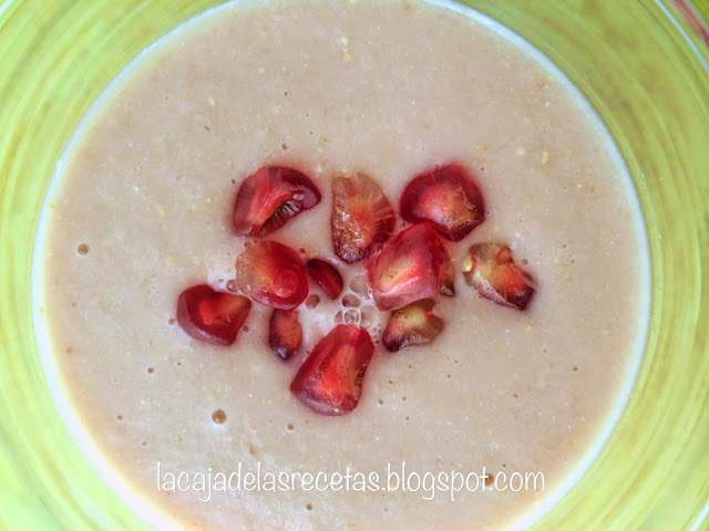 Pelar la fruta e introducir junto con el requesón en el vaso de la thermomix, vaso, o lo que quiera que tengas para hacer zumos. La granada es lo que más te dará la lata, debes sacar la pulpa evitando la piel amarilla, pues amargaría. Batir hasta que tenga una textura suave. Recuerda que un smoothie no es muy licuado, digamos que es un zumo que se mastica, pero si no te gusta tomarlo tan espeso, puedes añadir un poco de agua.