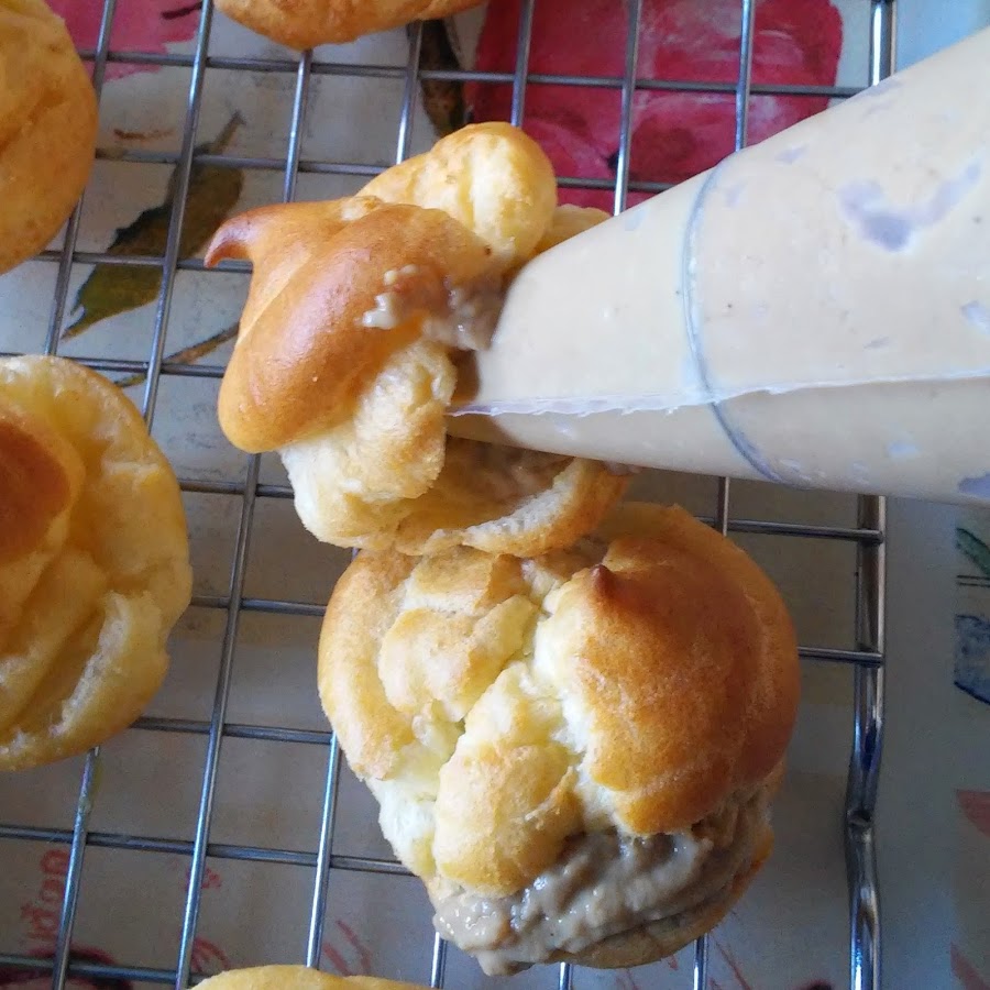 Abrimos nuestros profiteroles y los rellenamos con la ayuda de una manga.
