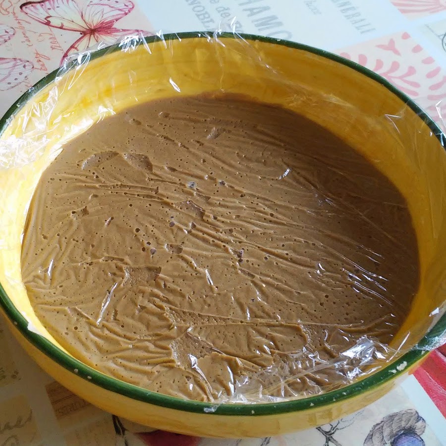 Seguimos removiendo hasta que espese. Retiramos y dejamos que se templen. Ponemos papel film y llevamos a la nevera hasta que enfrien del todo.