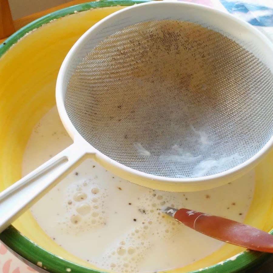 En un cazo calentamos la leche y antes de que comienze a hervir retiramos y le añadimos la mezcla de yemas a través de un colador por si nos ha hecho nata (crema de leche) ( como me pasó a mi ).