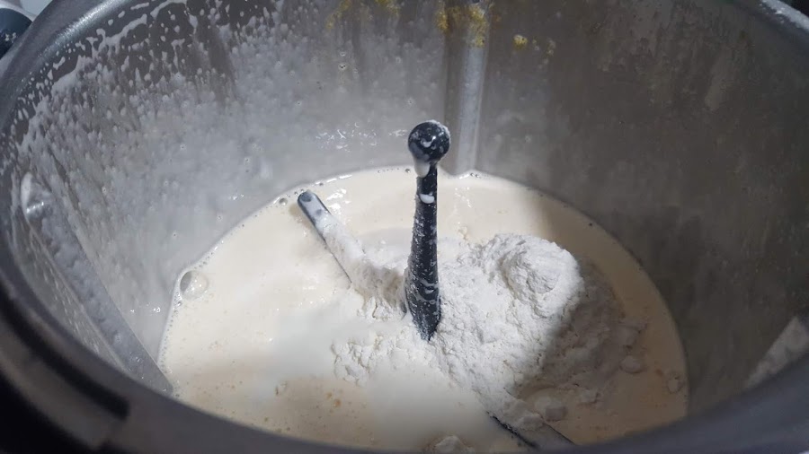 3.- Añadimos la harina con la levadura de golpe y mezclamos 15 segundos, velocidad 4. Dejamos enfriar quitando la tapa.