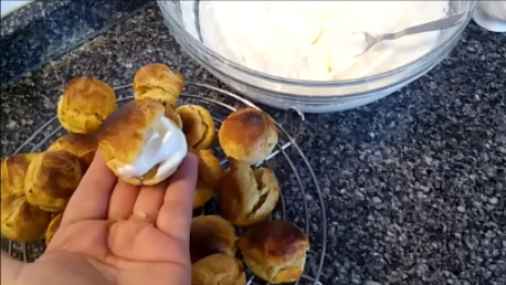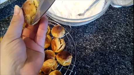 Abre los profiteroles con ayuda de un cuchillo o unas tijeras de cocina y rellénalos.