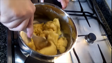 Una vez que rompa el hervor, apaga el fuego y añade de golpe la harina, previamente tamizada y remueve enérgicamente hasta que la masa se despegue de las paredes de la cacerola.