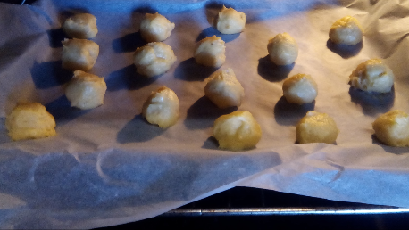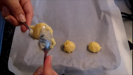 Y con la ayuda de dos cucharitas, haces una bolitas más o menos del tamaño de una nuez y colócalas en una placa o bandeja con papel para horno. Ponlas separadas porque crecen un poco.