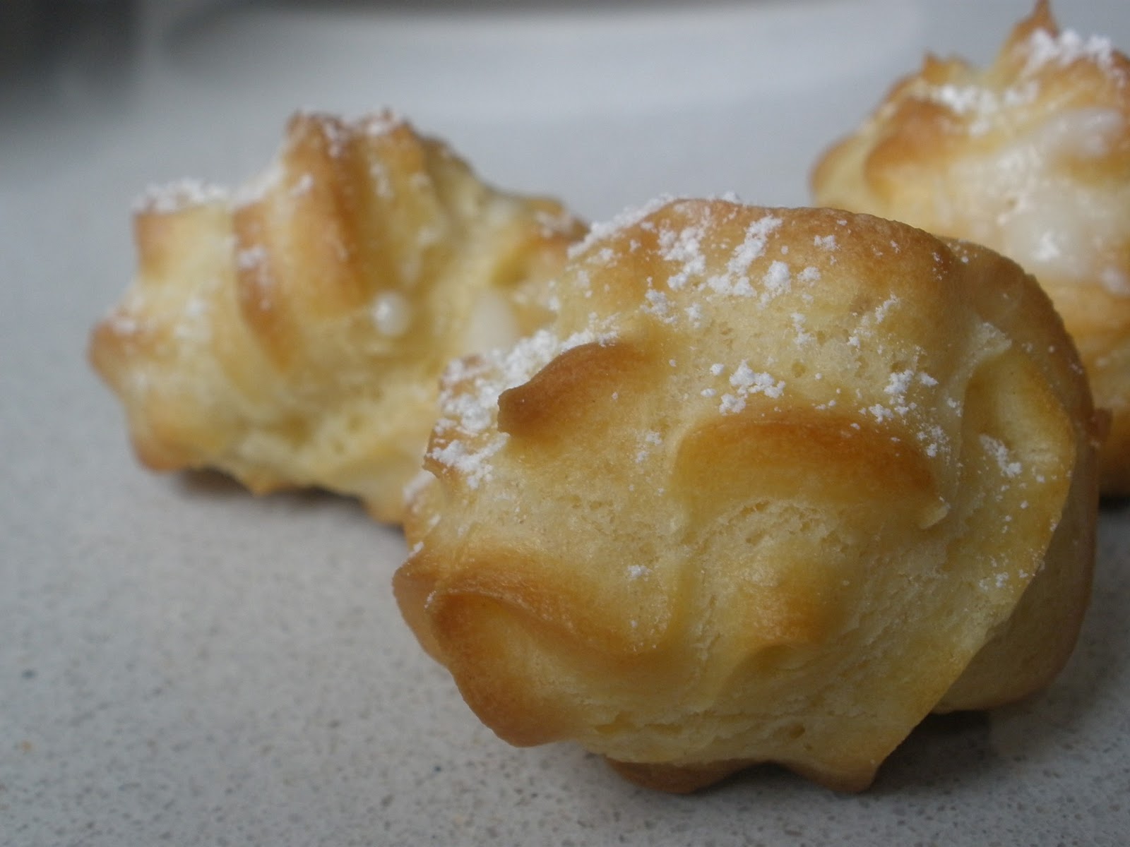 Calentamos el horno a unos 185 ºC y con la manga pastelera hacemos unos montoncitos del tamaño de una nuez sobre la placa de horno previamente forrada de papel de hornear. Después de 10 minutos subimos la temperatura a 195 ºC y horneamos 20 minutos mas. Los montoncitos que hemos puesto en la placa se inflaran y doraran, y esto nos indica que están listos.
