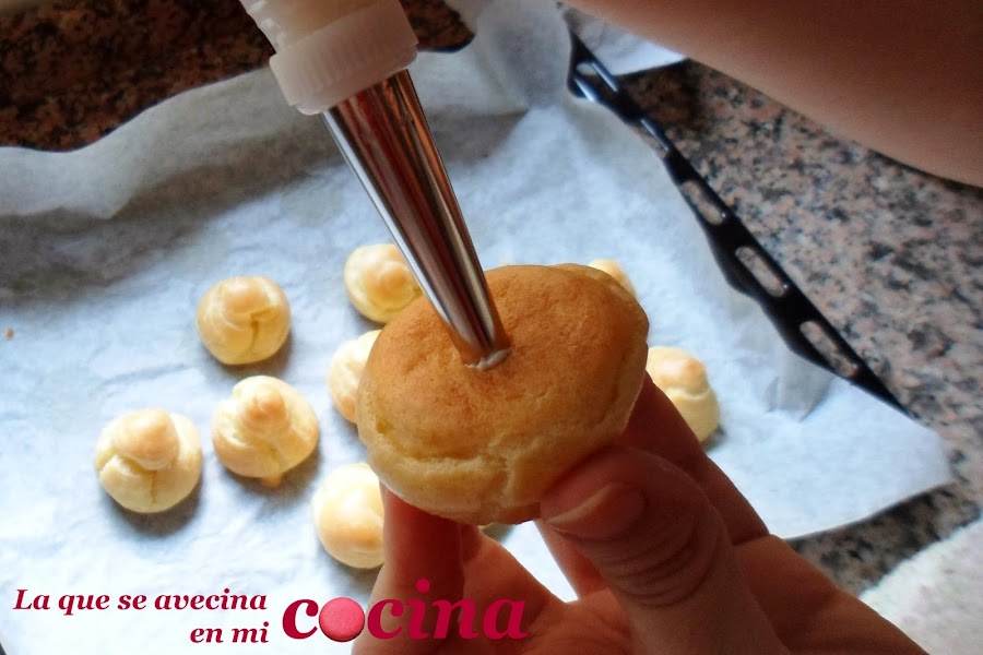 Para rellenar los profiteroles, le haremos un agujerito en la base (es donde menos se ve estéticamente hablando) y comenzaremos a rellenar hasta que notemos como se "inflan". No es conveniente rellenar demasiado porque sino al quitar la boquilla, se saldría demasiado relleno. Para rellenar este dulce yo he usado la boquilla 230 de Wilton.