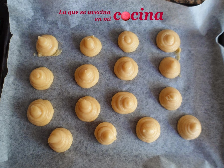 Vertemos la pasta en una manga pastelera con boquilla lisa. Sobre una placa de horno con papel sulfurizado vamos formando montoncitos. No os puedo decir un tamaño exacto, pero cuando veáis que son fáciles de manejar sin llegar a ser exageradamente grandes.