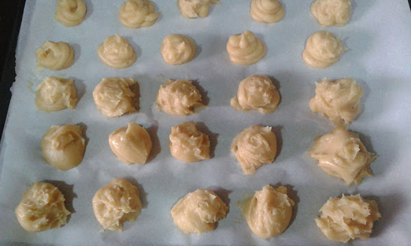 Preparamos una bandeja de horno con papel sulfurizado, y formamos bolitas de masa con una manga pastelera o con 2 cucharillas de café, del tamaño que deseemos.