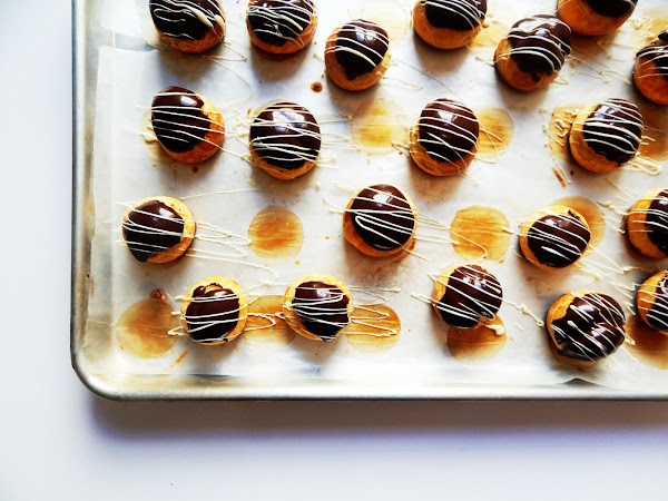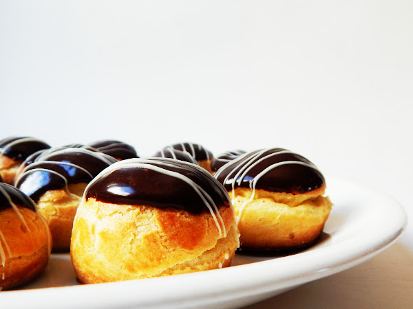 El único cambio que le hice fue que barnicé con huevo los profiteroles, porque no estaba segura que me quedaran igual de doraditos que la receta original si no agregaba ese paso. Ya saben que mi horno es medio voluble y aveces no me dora. Así que los barnicé con huevo. Y salieron del horno lindísimos, ¡doraditos!
