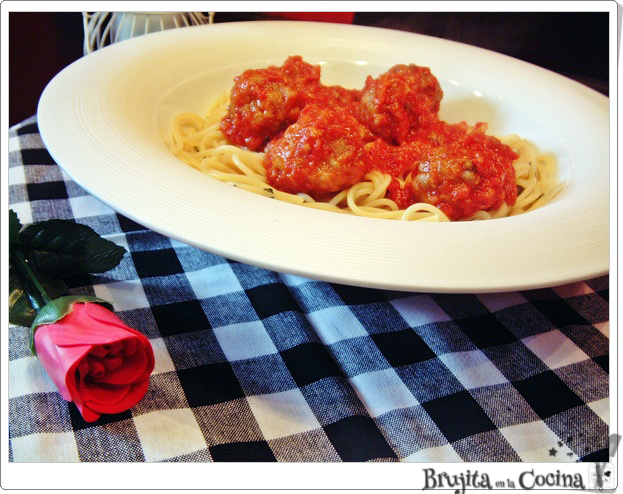 El plato principal creo que es uno de los más románticos, o quién no se acuerda de la escena de La dama y el vagabundo comiendo un plato de espaguettis con albóndigas. Escena románticamente culinaria. Y esta es mi propuesta.