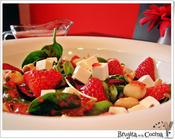 Como entrante una ensalada, para comenzar la velada con algo fresquito y además vegetariana, ingredientes casi de andar por casa que puedes modificar un poco al gusto. Asi que el primer plato una ensalada de fresas.