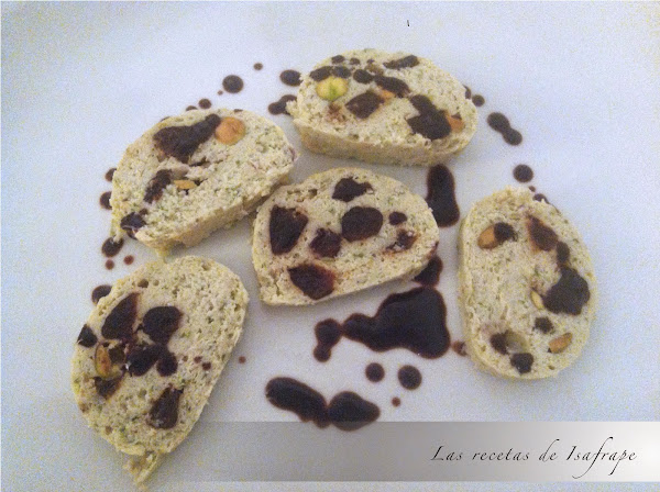 Fiambre de pollo relleno de pistachos con salsa de chocolate. Fiambre casero, hecho en casa. El relleno lo podéis hacer a vuestro gusto.