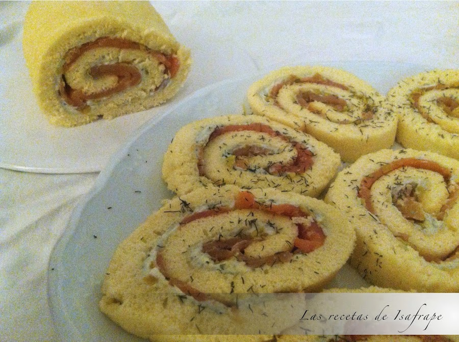 Rollitos agridulces de salmón y roquefort. Brazo de gitano dulce relleno de salmón, puerro y roquefort. Para sorprender.