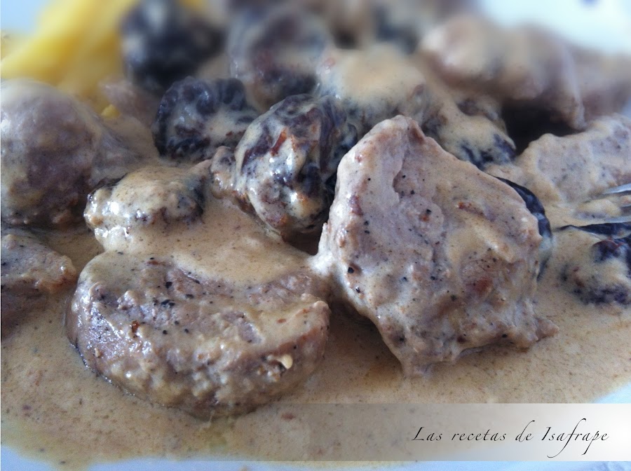 Solomillo con nata (crema de leche) y ciruelas. Plato muy, muy sencillo y con una combinación interesante de sabores.