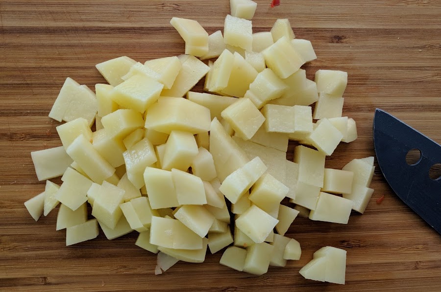 Dejamos que se vaya sofriendo y mientras pelamos las patatas y cortamos en cuadraditos