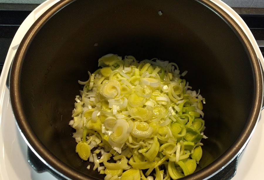 Sal y pimienta negra recién molidaSalpimentamos el pollo y reservamos. Partimos en trocitos la cebolla y en rodajas el puerro. Ponemos en la cubeta y añadimos el aceite. Programamos menú freír