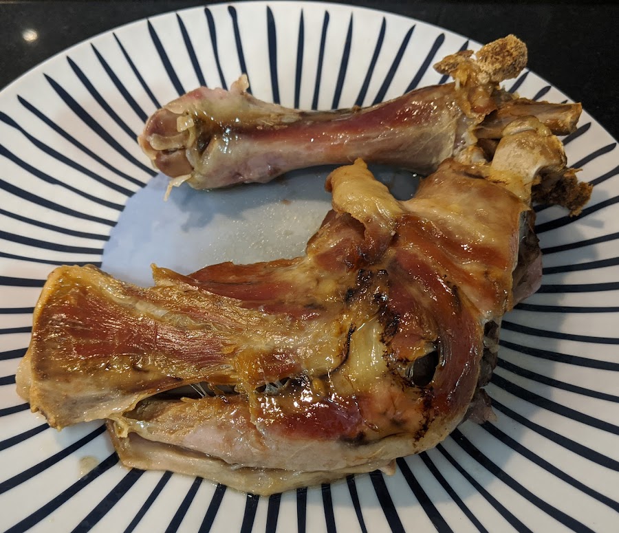 A falta de alguna prueba más, este plato sale bien y es cómodo y limpio. El cordero queda súper jugoso y no hacen falta golpes de horno para conseguir el dorado final, la cerámica de la cubeta y la grasa de la pieza hacen milagros.