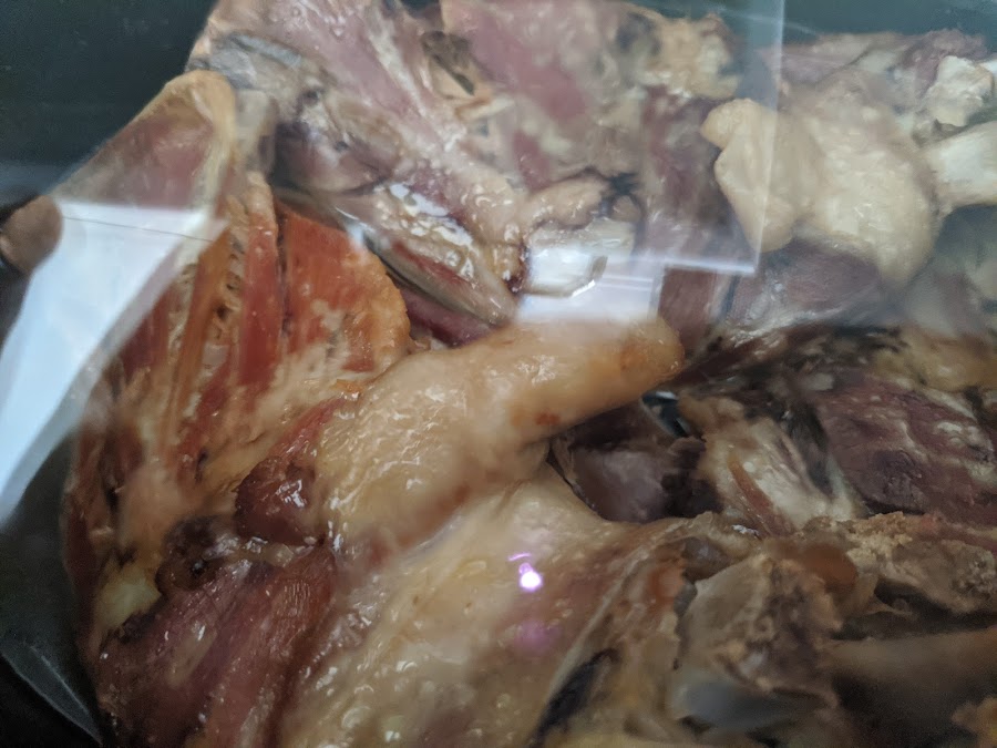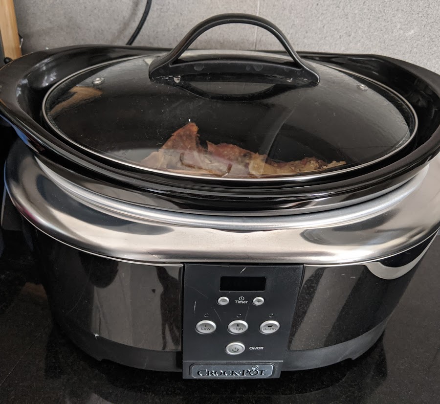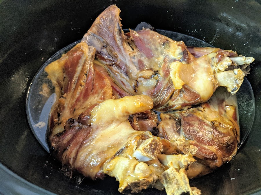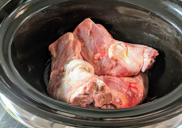 Compré 3 paletillas de lechal y pedí que dieran un golpe en el hueso: no quedan tan bonitas pero se acomodan muy bien en la cubeta de mi crockpot de 5,7 litros. Incluso habría espacio para una más.
