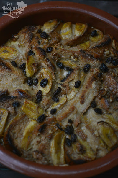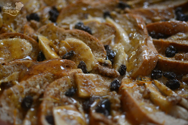 Corta en rodaja alargadas los plátanos y los vas poniendo entre los panes, sin dejarningún pan sin que tenga plátano, luego le agregas las uvas pasas, las nueces así como la miel, la canela y el azúcar moreno.