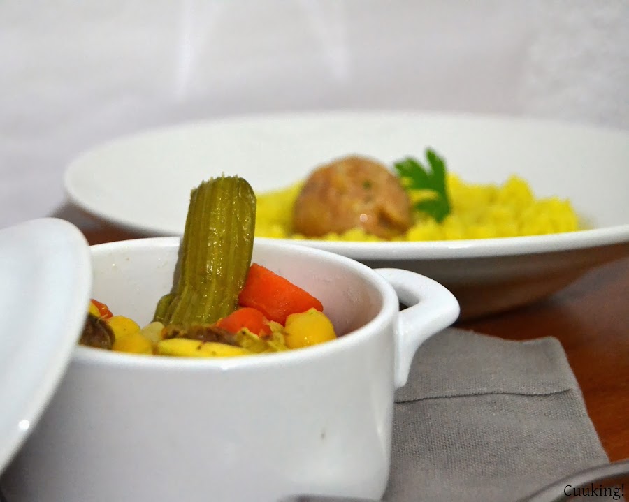 8.- El puchero se toma en dos tandas o servicios, primero el arroz junto con la pelota y a continuación las carnes, las verduras y los garbanzos. Otra opción en colocar toda la carne etc en una fuente para compartir en el centro de la mesa o como en este caso usar unas fuentes individuales para servirlo junto con el arroz.