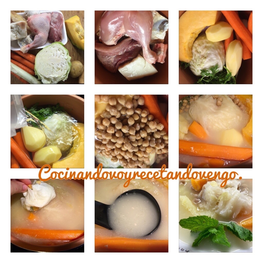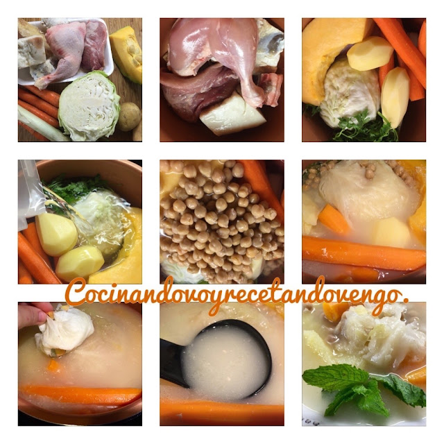 Nací en Barcelona, luego de niña vine a vivir a Andalucía, aunque cada año volvía para visitar a mis abuelos, tíos, primos, mi madre de Madrid y mi padre de Málaga, así que creo que puedo decir que algún variante de esta receta he conocido jajajajaja yo sin desmejorar a ninguno, el que realmente cocino en mi casa con frecuencia y nos gusta a todos, es este que os traigo hoy, "el Puchero con su pringá" que está riquísima y a los niños les encanta. Un caldo blanco con verduras, carne de pollo, ternera, cerdo, pavo y los "avíos del puchero", como son tocino, hueso de jamón, costillas saladas etc acompañadas de garbanzos, suele hacerse mucha cantidad de caldo para en días posteriores servir ese caldo con fideos o arroz. Yo os traigo la cantidad para 8 platos, que en mi casa tenemos para dos ocasiones, el primer día nos comemos un plato con garbanzos y verduras como primer plato y de segundo plato la pringá, en días posteriores para la cena sirvo el caldo con fideos, huevo duro y tacos de jamón lo que conocemos como sopa de picadillo. Es muy tradicional también servir con una rama de hierbabuena, sabor y aroma que me encanta.