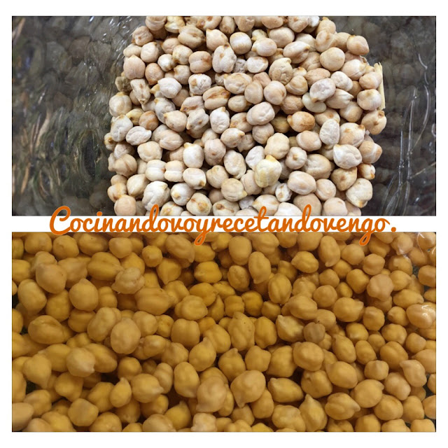 NOTA: Comenzamos la noche anterior poniendo a remojo los garbanzos, bien cubiertos de agua, unas 8-12 horas aproximadamente. Yo suelo hacer doble cantidad y al día siguiente uso la mitad para la receta del día y la otra mitad la escurro y guardo en el congelador, así la tengo de reserva por si un día se me olvida poner los garbanzos a remojo y los tengo listos para consumir en el congelador.
