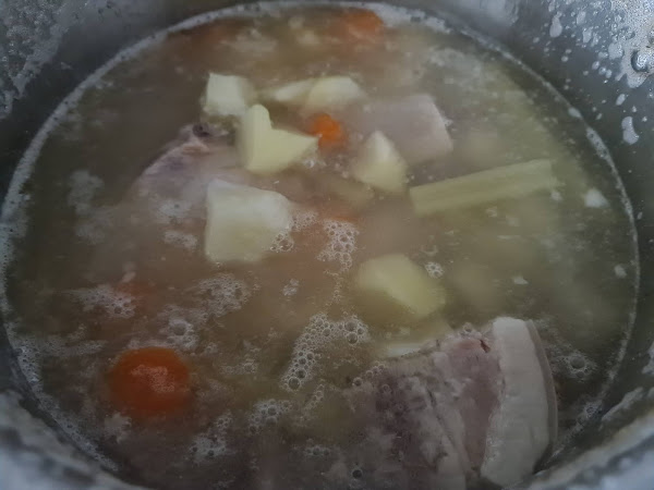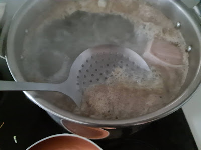 2. - Cuando empiece a hervir, con una espumadera, lo desespumamos, quitando la capa de espumilla que quede por encima, tapamos y los dejamos pitando 15 minutos. Si no es olla exprés, dejamos 30 minutos.