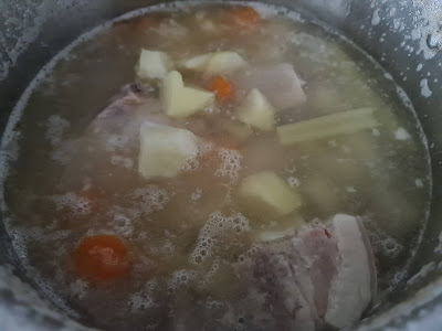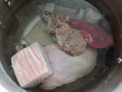 1. - Comenzamos enjuagando todos los huesos y la carne y los "avíos" los ponemos en la olla exprés cubriendo bien de agua.