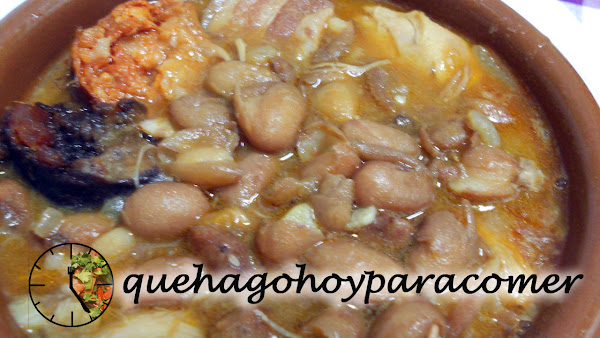 En una olla ponemos las alubias y el agua donde se han hidratado, el pollo, la panceta y el chorizo y completamos cubriendo con agua todos los ingredientes. Ponemos a calentar a fuego medio, y dejamos que hierva todo junto alrededor de dos horas. Añadiremos más agua si vemos que se va consumiendo y desespumamos.