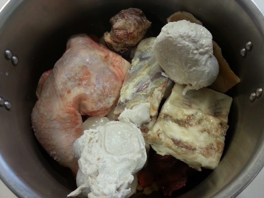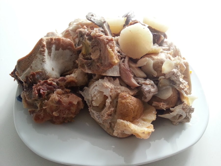 6. - Sacamos la carne, los huesos y el pollo.