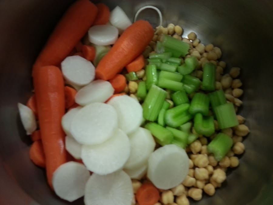 1. - En primer lugar troceamos todas las verduras y las ponemos junto con los garbanzos en la olla expréss.
