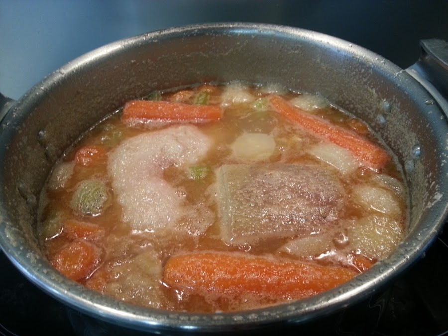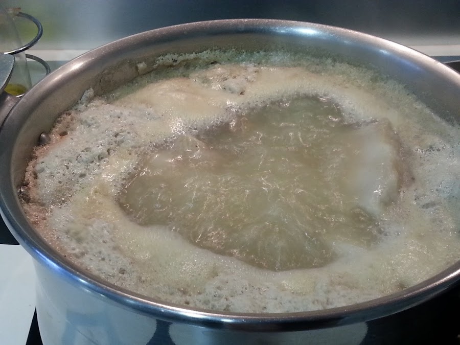 3. - Cubrimos con agua y ponemos a fuego medio fuerte, para que empiece a espumar, y sube toda la suciedad que pudiera tener los huesos y demás.