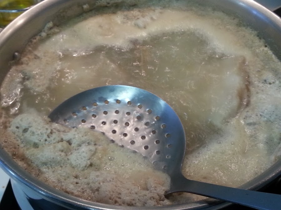 Entonces con una espumadera, que de ahí su nombre, vamos quitando la espuma hasta que esté bien limpio el caldo.